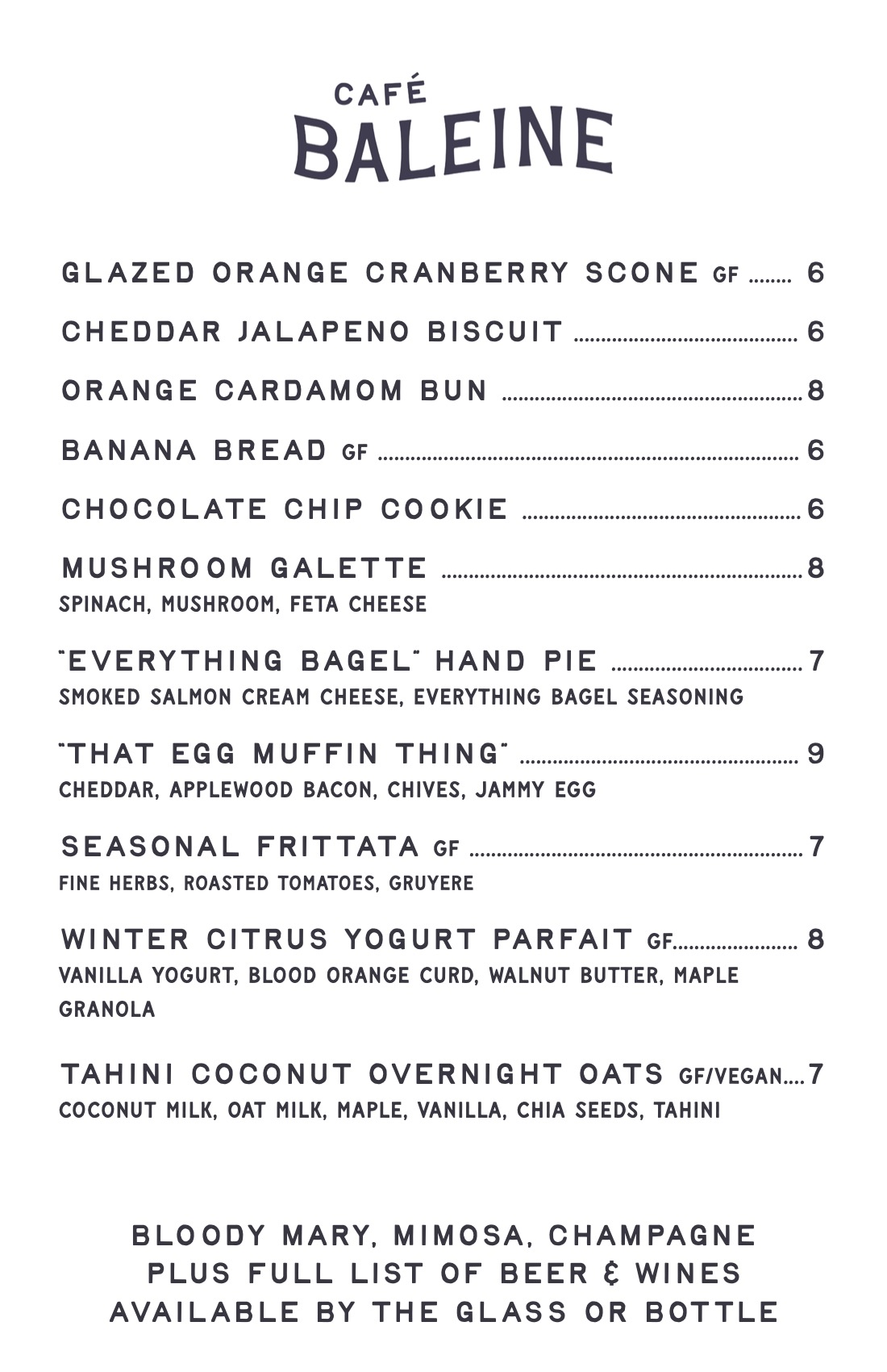 Café Baleine is our take on mornings. Thoughtful coffee, fresh pastries, and the same attention to detail you know from our evenings.
